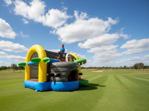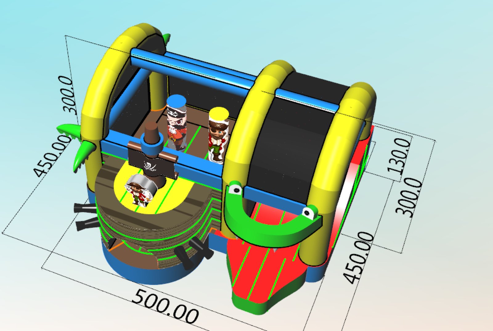 Unsere Hüpfburg im Krokodil-/Piraten-Design ist ein aufregendes Spielzeug für Kinder jeden Alters. Mit einer Größe von 5 x 4,5 x 3 Metern bietet sie ausreichend Platz zum Springen, Toben und Spaßhaben. Eine seitliche Rutsche sorgt für zusätzlichen Spaß bei den Kindern. Die Hüpfburg wurde sorgfältig mit einem farbenfrohen und detailreichen Krokodil- und Piraten-Design gestaltet, das die Fantasie der Kinder anregt. Sie verfügt über eine stabile Konstruktion und besteht aus hochwertigem Material, um eine sichere und lang anhaltende Nutzung zu gewährleisten. Die Hüpfburg kann sowohl drinnen als auch draußen aufgestellt werden und eignet sich somit ideal für Geburtstagsfeiern, Veranstaltungen oder einfach zum Spielen im Garten. Die Krokodil-/Piraten-Hüpfburg ist ein garantierter Erfolg und wird stundenlangen Spaß für kleine Abenteurer bieten.